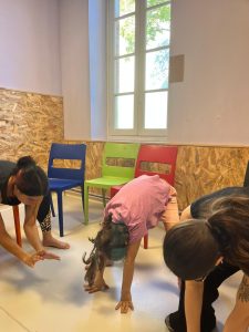 Pour cet atelier, des groupes de 5 enfants sont formés afin qu’ils puissent profiter, en effectif réduit, de deux sessions de 30 minutes chacune (musique et yoga), séparées par une pause de 30 minutes, durant laquelle le groupe se retrouve au complet afin d’interagir et de partager des moments de complicité.